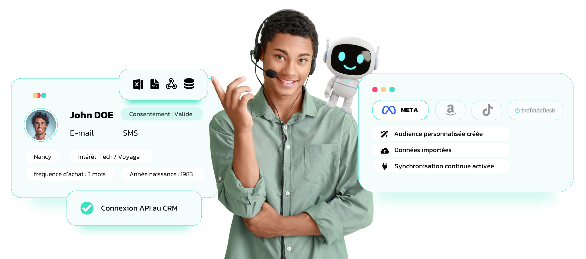 À l’aide des connecteurs API, des flux XML, des tableurs ou des formulaires, centralisez toutes les données de contact en un seul endroit.